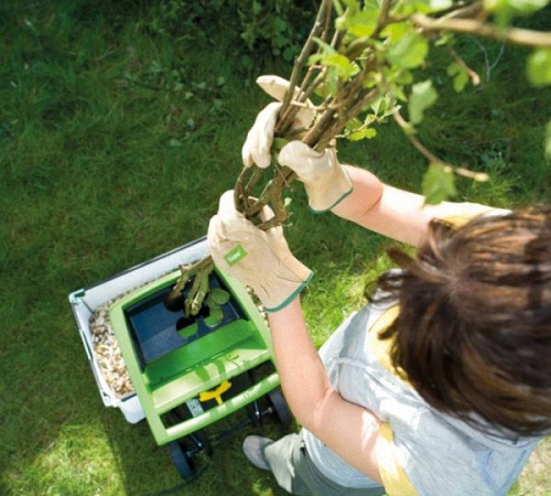 Садовые измельчители оснащаются наклонной загрузочной воронкой. Управление системой осуществляется сенсорными переключателями. Они предполагают защиту от брызг при загрузке сора и автоматического запуска механизма при сбое в работе сети.