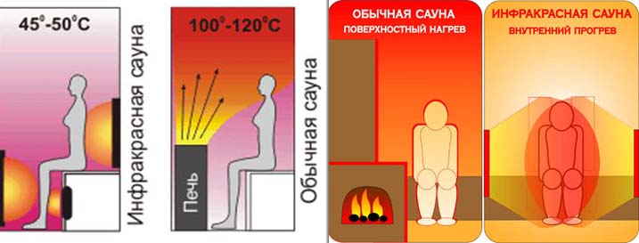 В современных саунах в качестве отопительных приборов применяют электрические и газовые инфракрасные обогреватели. Их волны безопасны для человека, поэтому теплотерапия полезна практически в любом возрасте. Получасовое посещение ИК сауны равносильно 2-м часам, проведенным в традиционной бане.