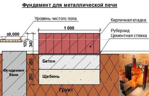 Определение размеров фундамента. В первую очередь необходимо определить размеры фундамента. Стандартная высота стяжки, на которую может быть установлена банная печь, составляет 20 см. Данный показатель является наиболее оптимальным в том случае, если вы планируете обустройство конструкции, характеризующейся наличием «кирпичной рубашки» и массивного дымохода. Обустраивая бетонную стяжку, необходимо подготовиться к тому, что пол несколько поднимется. Иногда печи с выносной топкой осуществляют на «кирпичной подушке», однако в этом случае необходимо произвести тщательные расчеты, так как если к высоте кирпичной подушки прибавить высоту фундамента – потолки значительно понизятся.