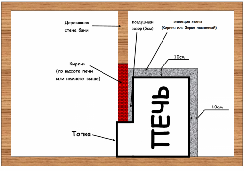 Подготовка стен. В идеале подобная схема установки будет уместна только в том случае, если стены изготовлены из любого негорючего материала, в том числе и кирпича. В противном случае, если стены изготовлены из традиционной древесины, рекомендуется выполнить их предварительную облицовку огнестойкими изоляционными материалами.