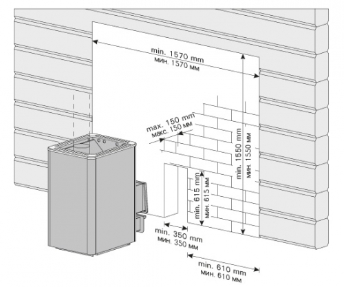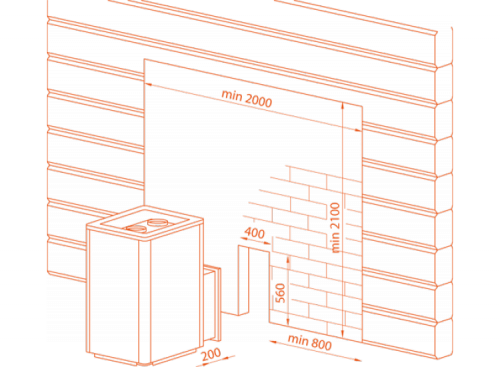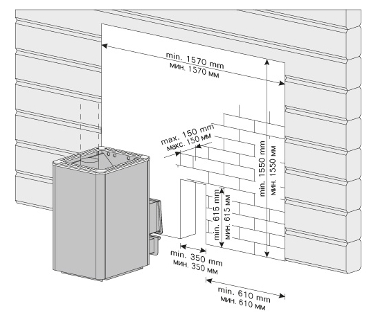 Если в процессе монтажа печи с выносной топкой вы не планируете устанавливать термоизоляторы или защитные экраны, необходимо сохранить расстояние от агрегата до потолка не менее 1,2 метра.