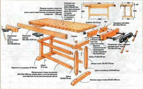 Конструкция столярного верстака отличается высокой прочностью и функциональностью: на столешнице станка можно закреплять обрабатываемые изделия, в специальных ящиках держать инструменты, высота слесарных верстаков может регулироваться в соответствии с ростом человека.