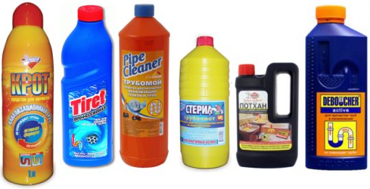 Сегодня на прилавках магазинов очень разнообразный выбор химических препаратов для прочистки засора. Безусловно, с их помощью будет незамедлительный результат, но не стоит забывать, что такая химия содержит кислоты и щелочи и применять ее нужно с особой осторожностью.