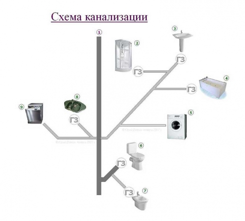 Обычно канализация берет свое начало с кухни и проходит в общий стояк через ванную и туалет.