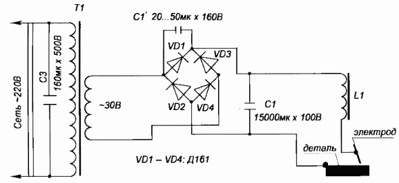 С развитием электротехники принципиальная схема сварочного трансформатора совершенствовалась, и сегодня производятся сварочные аппараты, в схеме которых используются дроссели, диодный мост и регуляторы силы тока. На представленной схеме видно, как диодный мост интегрирован в сварочный трансформатор (фото ниже).