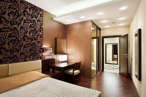 При необходимости сфокусировать все пространство на значительный по размеру или функциональным свойствам объект интерьера, используются вставки из обоев, занимающие ощутимый участок, вплоть до использования площади потолка.