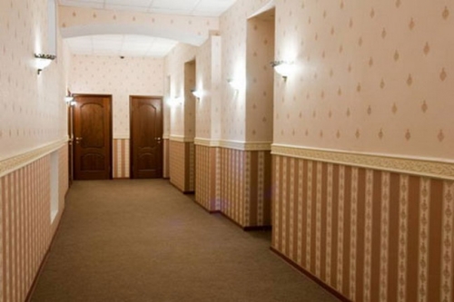 Как поклеить прихожую двумя видами обоев. Здесь принято использовать горизонтальный способ, когда нижняя часть стены оклеивается более темными обоями, а граница разделена декоративным бордюром.