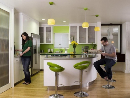 Если барная стойка вышла на славу, то вполне логично, что у хозяина возникает желание сделать на ней акцент с помощью освещения. Общее освещение не годиться для этой цели, барная стойка на его фоне растворится в интерьере кухни. Лучше всего для выделения барной стойки использовать галогенные светильники, что вмонтированы в расположенную над столешницей балку.