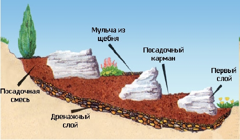 Земля для устройства альпинария должна быть тщательно очищена от корней сорняков. В почву добавляют перегной, измельченный торф, крупнозернистый песок. Все составляющие берутся примерно в равных долях и тщательно перемешиваются.