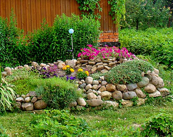 Снизу вкапывают наиболее крупные камни, а среднего размера и поменьше укладываются выше. Они должны быть уложены устойчиво, поэтому их нужно пересыпать грунтом, песком и мелким гравием.