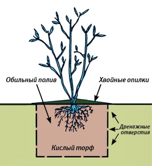 В выкопанной ямке нужно аккуратно разложить корни и засыпать их субстратом, после чего как следует пролить водой и произвести мульчирование, то есть укрыть поверхность земли вокруг саженца каким-либо материалом, который будет регулировать воздушный и водный баланс в поверхностных слоях почвы, а также защитит от сорняков. Это может быть торф, солома и керамзит, древесные опилки и мелкая стружка, опавшие листья и скошенная трава. Перед применением мульчу необходимо увлажнить, чтобы она не забирала влагу у растения. После того как голубика подрастет можно будет обновить слой мульчи. При появлении в ней сорняков их требуется быстро удалять, не позволяя им разрастись.