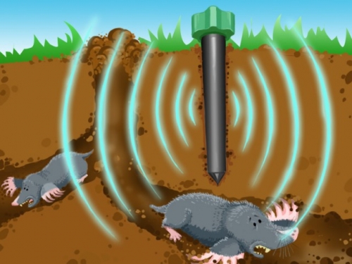 Функционируют отпугиватели кротов на основании использования ультразвукового излучения. В почвенной среде создаются колебания, не приемлемые для вредителя. Когда крот попадает в радиус действия отпугивателя, он начинает испытывать постоянный дискомфорт, воспринимает это как опасность, что заставляет его бежать из участка. Радиус действия устройств отличается, зависимо от модели и производителя.