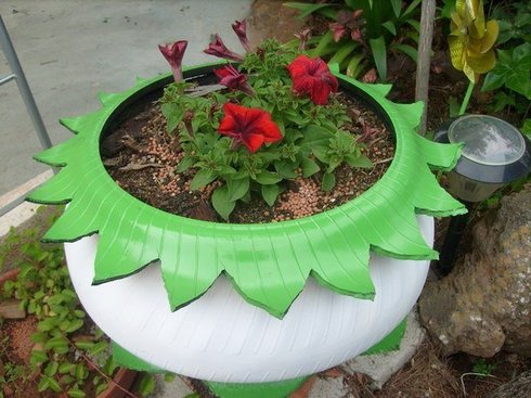 Если в вашем распоряжении не просто покрышка, а целое колесо, можно сделать не обычную клумбу, а оригинальную вазу на ножке. Для этого необходимо точно так же, как и для клумбы-цветка нанести и вырезать рисунок лепестков и вывернуть шину. Разница лишь в том, что резина остается прикрепленной к диску. Диск с той частью покрышки, которая в первом случае отправлялась в мусор, при этом образуют симпатичную и аккуратную ножку вазона.