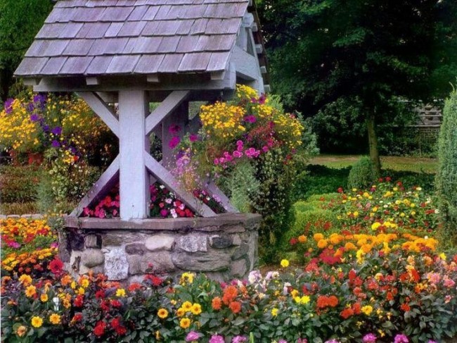 Но как бы красиво не был сделан оголовок колодца, чтобы он смотрелся гармонично, его надо окружить растениями. Для этого вокруг него можно насадить низкорослые цветущие кустарники или создавать каждый год новые композиции из цветущих однолетников. Кроме этого, цветы можно расположить в больших вазонах. В этом случае их можно переставлять несколько раз за лето. Растительные композиции подойдут к колодцу, выполненному в любом стиле.