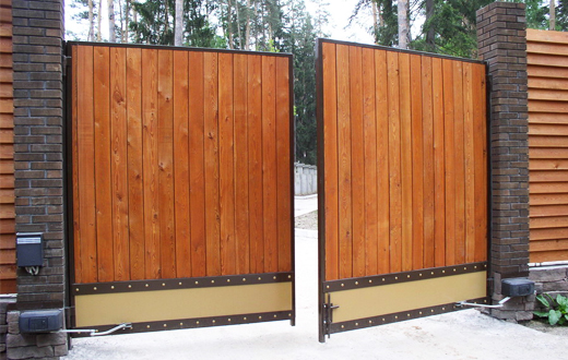 Сочетание прочности металла и изысканности дерева – оптимальный вариант для распашных ворот на приусадебном участке. Каркас ворот можно выполнить из металлопрофиля, а створки «обшить» деревом или более практичным – древесно-полимерным композитом.