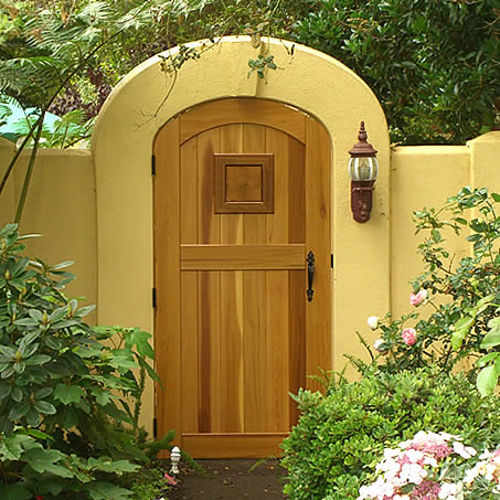 Оригинальная и одновременно простая форма входной дверцы подчеркивает лаконичность и утонченность сада в японском стиле.