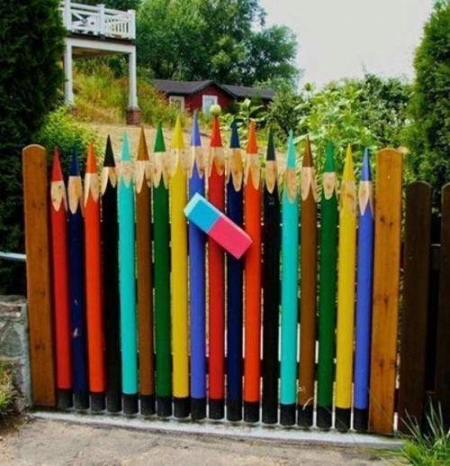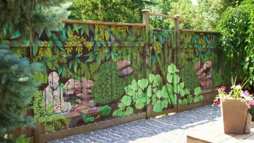 Калика и забор выступают единым декоративным элементом благодаря рисунку, нанесенному через все полотно ограждения.