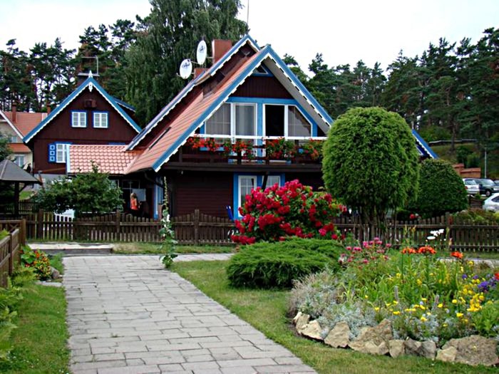 Сырой и прохладный климат диктует другие правила, в соответствии с которыми, сад размещают в глубине, а клумбы и огород – во дворе, неподалеку от жилой постройки. Это позволит защитить здание от чрезмерной сырости и будет способствовать его естественному прогреванию.